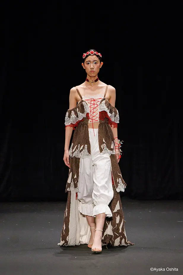 破れた布の隙間からお花が咲いてたり、キラキラしたディティールが出ていたり、羽が生えてたり、そういう部分で、変化や新たな姿になる様子を表現しました。最後のルックにはぜひ注目して欲しいです!