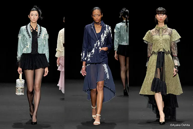 在学中に、国内最高峰のファッションコンテスト「装苑賞」でグランプリを獲得。さらに、東京ガールズコレクションと愛知県一宮市とのコラボレーション企画『BISHU COLLECTION produced by TGC』で現役大学生デザイナーとして抜擢されるなど、大きく活躍しました。今回、国際ファッション専門職大学の卒業生として、初のRakuten Fashion Week TOKYO参加という新たな功績を修め、今後の活躍にも期待が高まります。