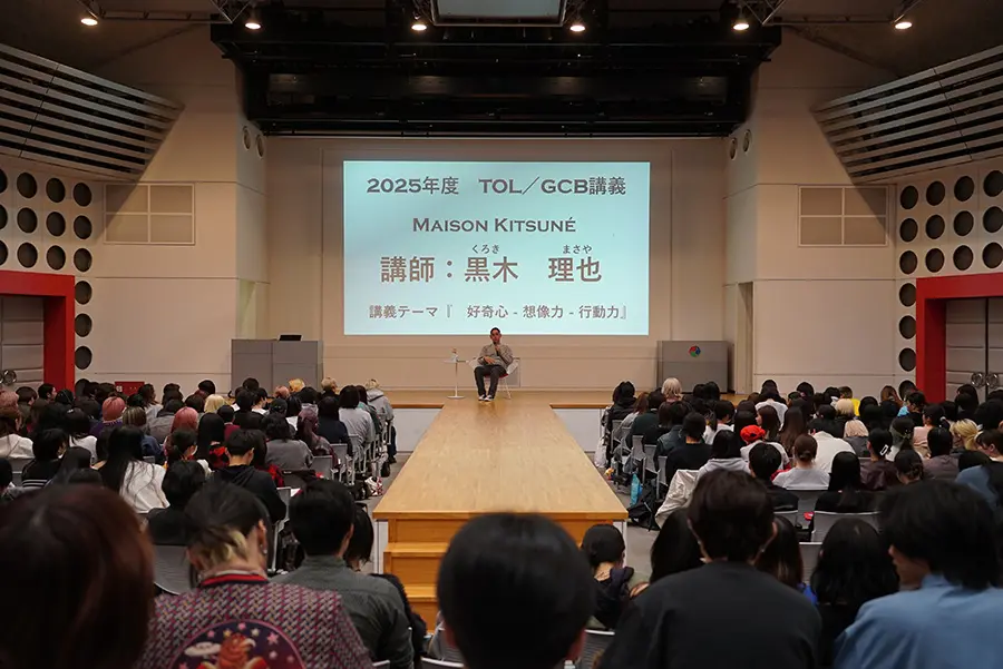 国際ファッション専門職大学では、世界のトップクリエイターを招いた特別講義を随時実施し、その感性やクリエイティブ術を学生が直接学ぶ機会を創出しています。今回は、パリ発のライフスタイルブランド「メゾンキツネ」の共同設立者、黒木理也氏による特別講義を行いました。「好奇心」「創造力」「行動力」をテーマに、学生たちに向けて熱く語っていただきました。