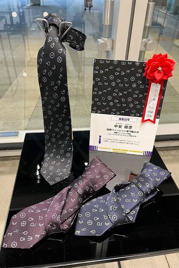 八王子織物工業組合が主催する「2024MulberryCityネクタイデザインコンペ」(後援:経済産業省、文部科学省、東京都、八王子市、八王子商工会議所、一般財団法人八王子繊維貿易館他)にて、ファッションクリエイション学科の中安晴彦さんが「八王子商工会議所会頭賞」を受賞しました。同学科の鈴木志晏さん、宮下夏光さんも入選を果たしました。