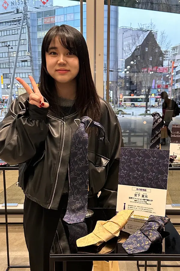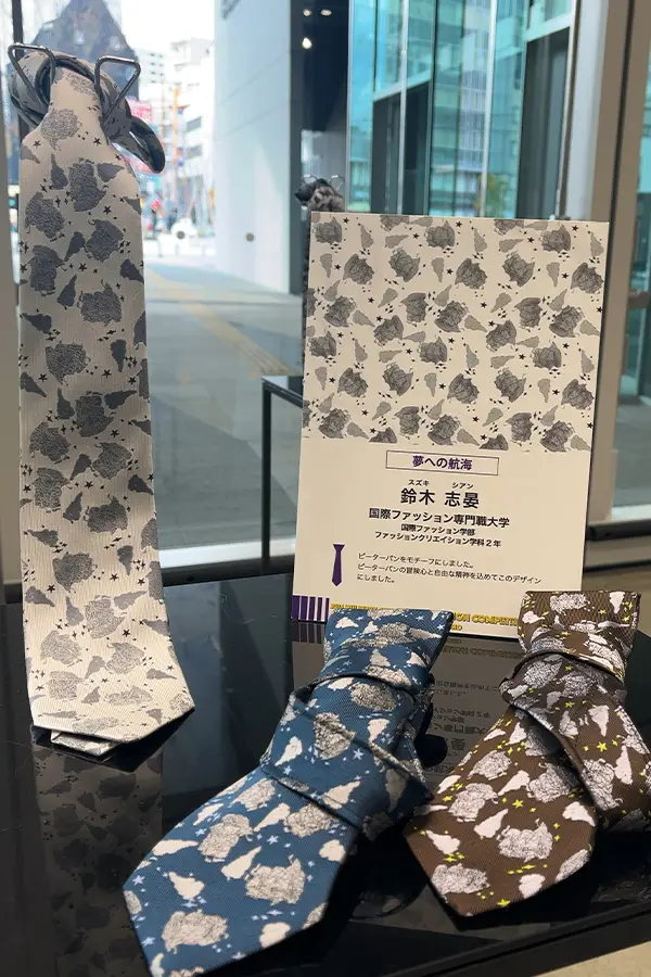 テーマ「星からの便り」から、星座をモチーフにしたデザインを制作。マインドマップを活用し、物語性や余白のある表現を大切にしました。完成したネクタイは、ジャガード織機による立体感と高級感が特徴です。「見る人に想像を促すデザインを意識するようになった」と語りました。