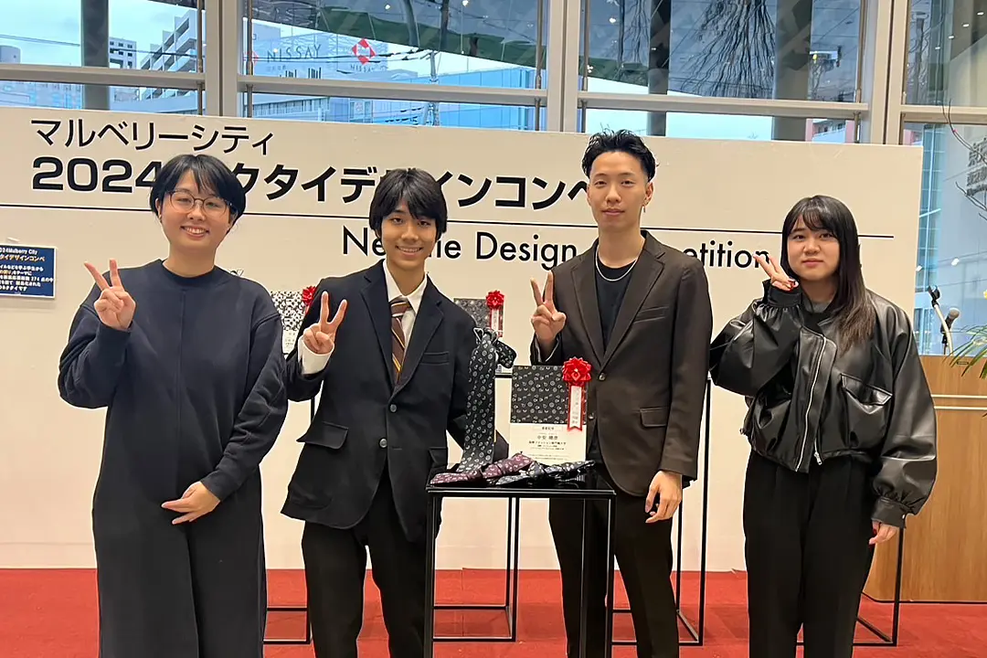 八王子織物工業組合が主催する「2024MulberryCityネクタイデザインコンペ」(後援:経済産業省、文部科学省、東京都、八王子市、八王子商工会議所、一般財団法人八王子繊維貿易館他)にて、ファッションクリエイション学科の中安晴彦さんが「八王子商工会議所会頭賞」を受賞しました。同学科の鈴木志晏さん、宮下夏光さんも入選を果たしました。